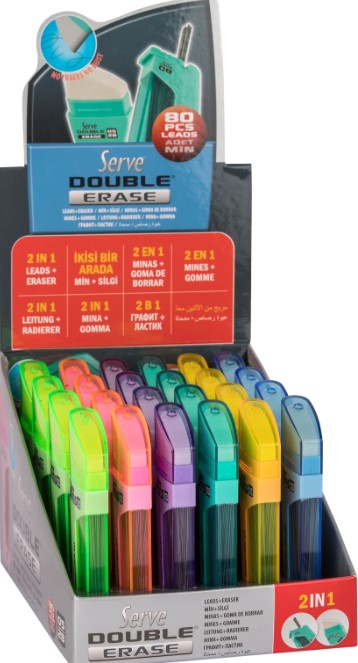 Le confort de transporter deux objets ensemble, Serve Double Erase combine mines 2B et gomme sans poussière ni trace. 0,5 mm, degré 2B, 80 mines avec 6 couleurs assortis